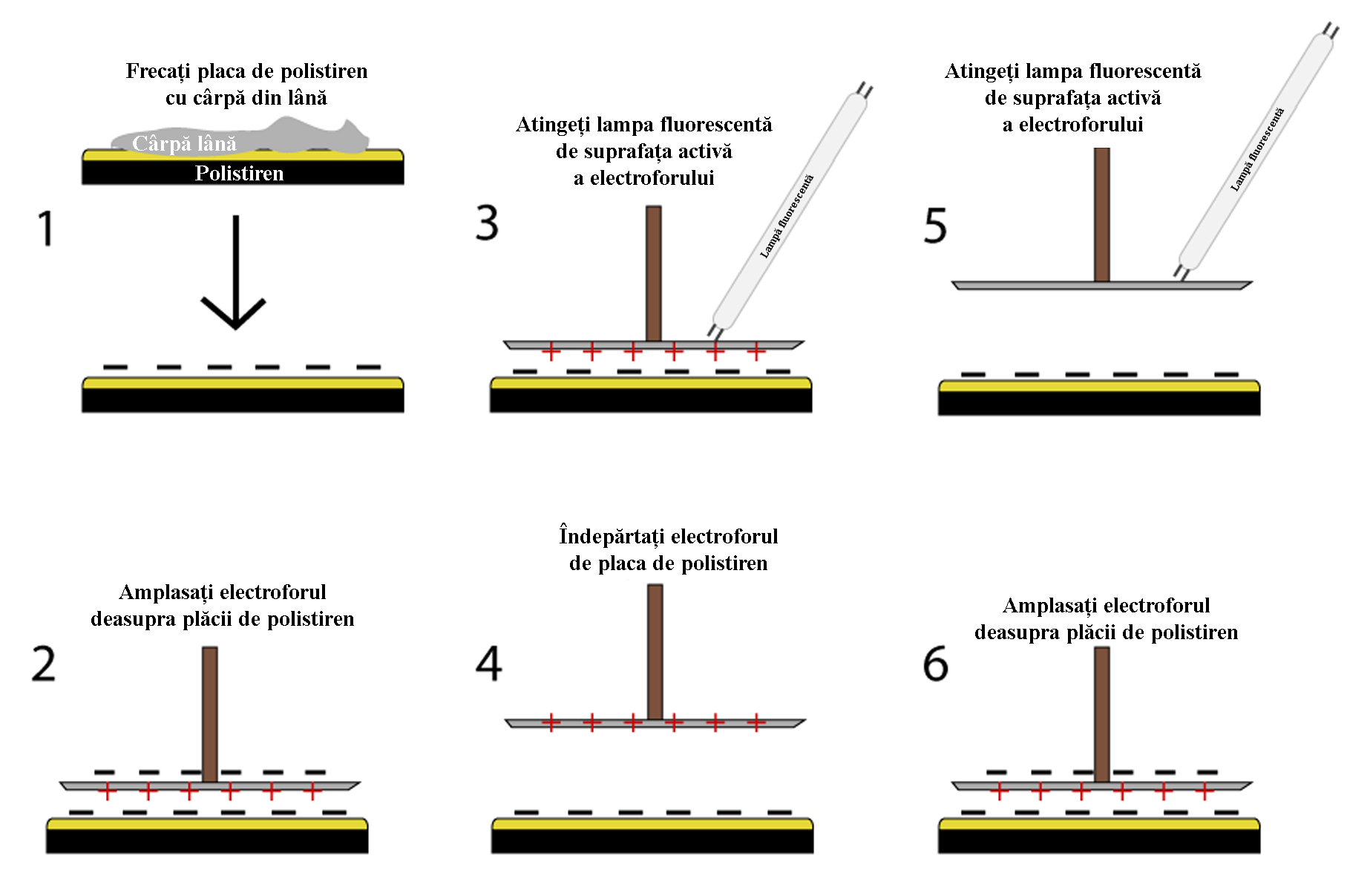 Lăsăm deoparte dispozitivul pe care l-am construit și așezăm pe masă bucata de polistiren, pe care o vom freca pentru mai mult de un minut cu cârpa din lână. După ce am aplicat acest tratament polistirenului, luăm electroforul, pe care îl vom ține de la baza paharului și îl așezăm peste bucata de polistiren, pentru a-i transfera o parte din sarcina electrică. Îl ridicăm, ținând tot de baza paharului și apropiem unul dintre degetele de la mâna liberă de marginea farfuriei. Vom auzi un pocnet, vom simți o mică înțepătură și, dacă în camera este întuneric, este posibil să observăm și o mică scânteie. Pentru ca efectul să fie mai evident, următoarea descărcare o veți efectua ținând electroforul la o distanță de minim 30 de centimetri de polistiren.